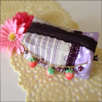イチゴチャーム付のキャラメルポーチです。縦、横、高さ7p、長さ14pの小物を入れていただくのにちょうどいいサイズとなっております。中身は花柄になっています。