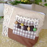 チョコレートチャームを付けた20pファスナーのポーチで、マチは6pとなっております。中は淡い緑のドット柄になっています。